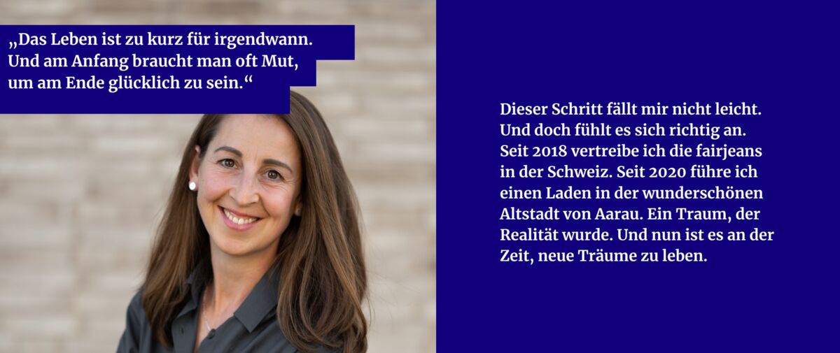 Dieser Schritt fällt mir nicht leicht. Und doch fühlt es sich richtig an. Seit 2018 vertreibe ich die fairjeans in der Schweiz. Seit 2020 führe ich einen Laden in der wunderschönen Altstadt von Aarau. Ein Traum, der Realität wurde. Und nun ist es an der Zeit, neue Träume zu leben.